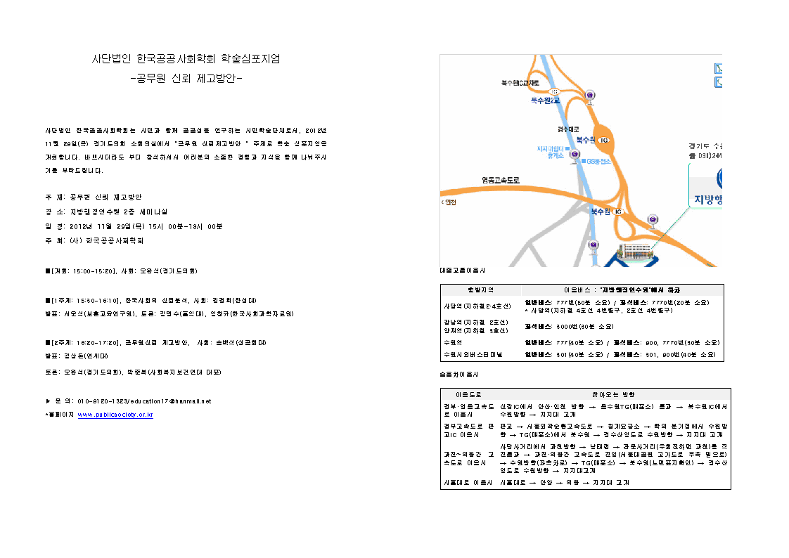 사단법인 한국공공사회학회는 시민과 함께 공공성을 연구하는 시민학술단체로서, 2012년 11월 29일(목) 경기도의회 소회의실에서 “공무원 신뢰제고방안 ” 주제로 학술 심포지엄을 개최합니다. 바쁘시더라도 부디 참석하셔서 여러분의 소중한 경험과 지식을 함께 나눠주시기를 부탁드립니다.
