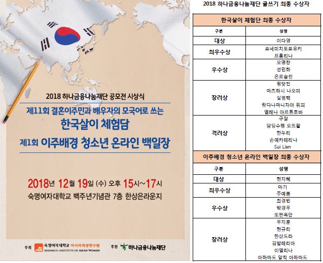 ○ 행사명: '2018년 결혼이주민과 배우자, 이주배경 청소년 글쓰기 공모전 시상식'