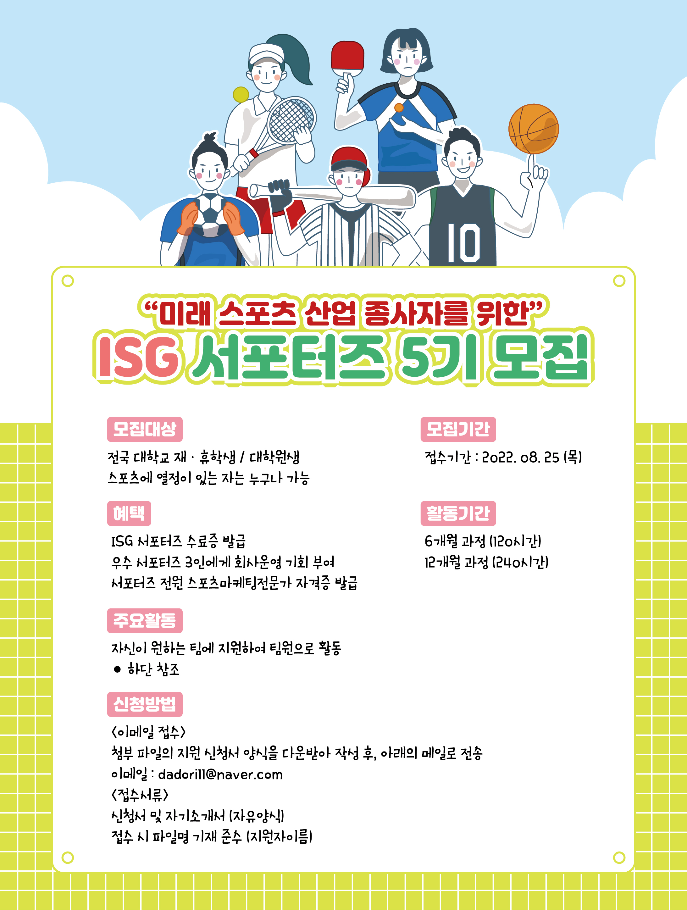 인터내셔널스포츠그룹(ISG)은 미래의 스포츠산업 종사자들을 위한 서포터즈(객원스포츠마케터 및 객원연구원) 과정을 실시합니다.