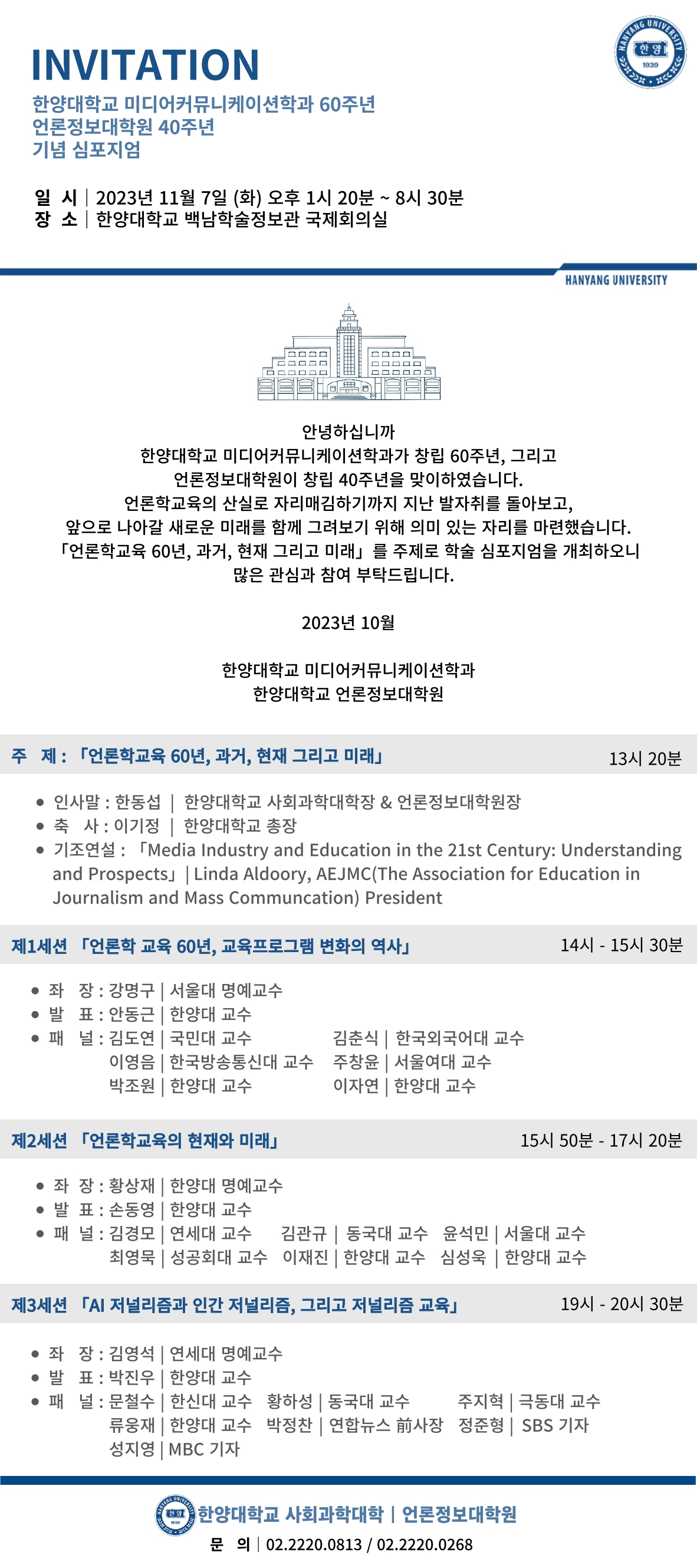 한양대학교 미디어커뮤니케이션학과 창립 60주년, 언론정보대학원 창립 40주년 기념 심포지엄 개최 안내