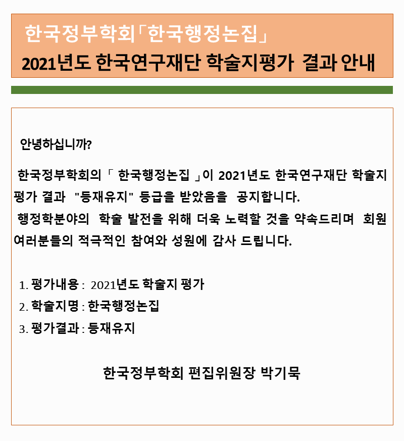 「한국행정논집」 2021년도 한국연구재단 학술지평가 결과 안내 "등재유지"