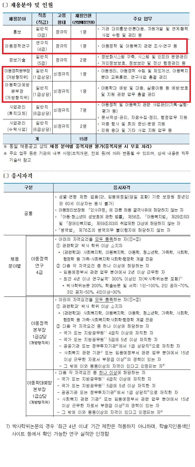 아동권리보장원에서 연구직 4급(부연구위원), 개방형직위(아동정책본부장 및 아동학대예방본부장)을 채용 중에 있습니다.