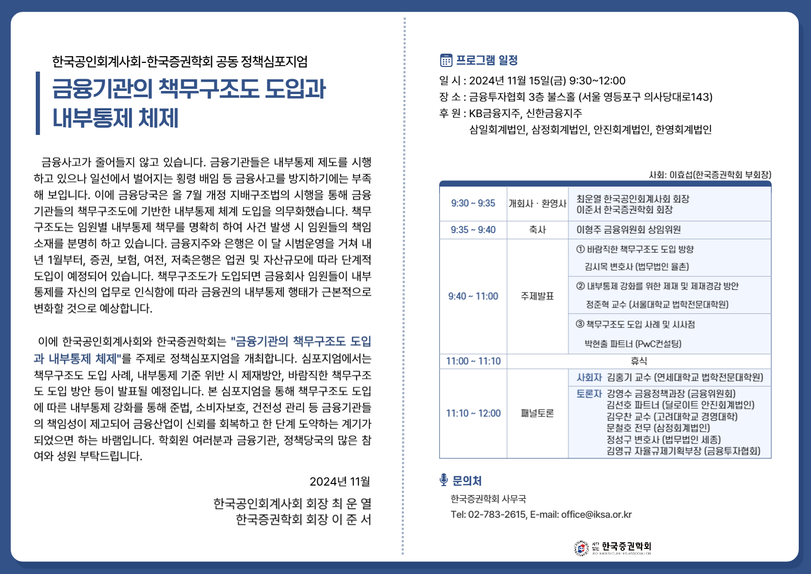 11월 15일 『금융기관의 책무구조도 도입과 내부통제 체제』심포지엄 개최 안내