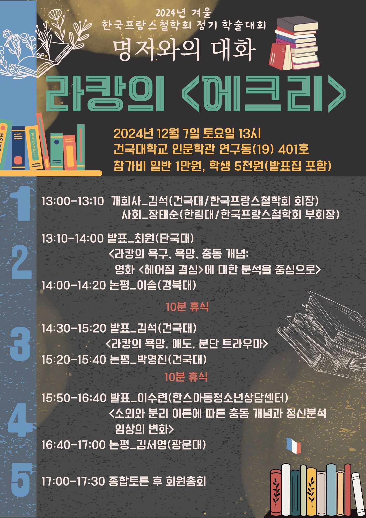 명저와의 대화는 프랑스철학회가 꾸준히 진행하는 학술 전통입니다. 현대 사상에 큰 발자취를 남긴 철학자들의 주저를 선택해, 사상의 핵심을 비판적으로 읽어내면서 문제의식을 오늘날 상황에 접목시키는 진지한 대화의 장으로 성과를 쌓아가고 있습니다. 라캉은 정신분석가이지만 구조주의와 포스트구조주의 논쟁사에 흐름에 큰 영향을 미치면서 주체의 철학을 새롭게 조명한 문제적 인물이기도 합니다.
