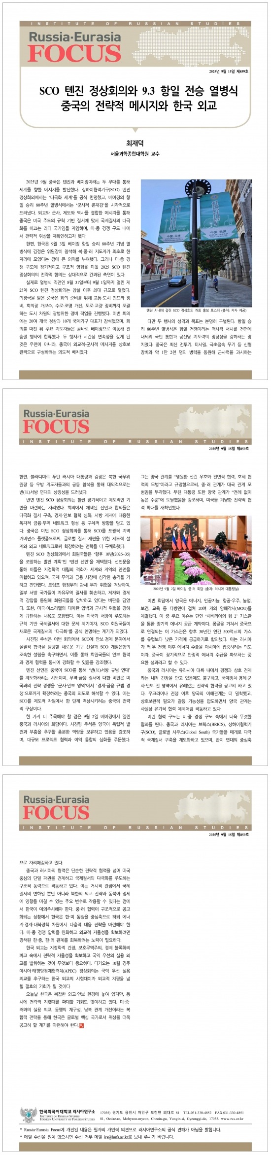 제859호 SCO 톈진 정상회의와 9.3 항일 전승 열병식: 중국의 전략적 메시지와 한국 외교