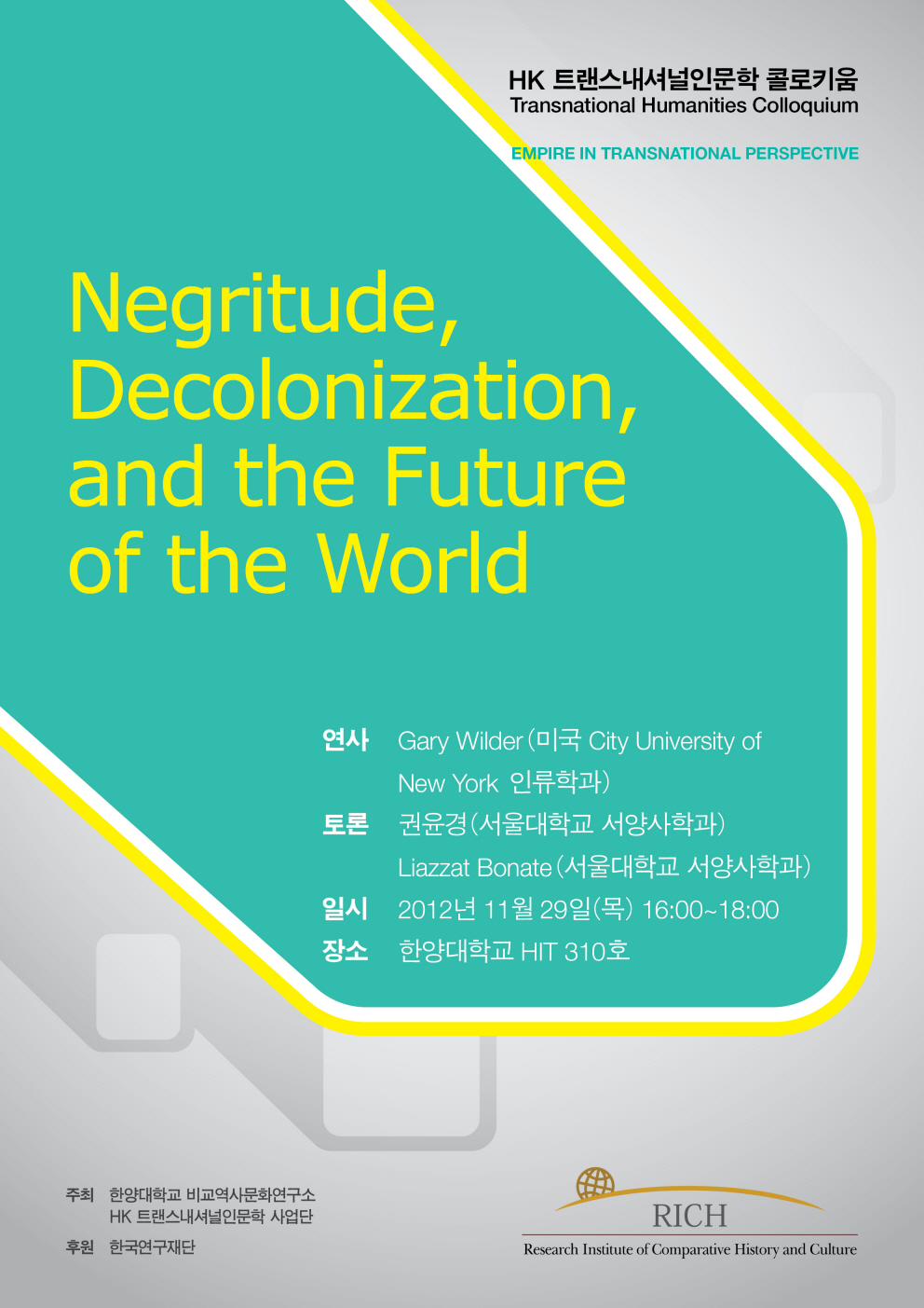 한양대학교 HK 트랜스내셔널인문학 사업단과 비교역사문화연구소는 오는 11월 29일 (목) 오후 4시에 2012년도 2학기 트랜스내셔널인문학 콜로키움 시리즈의 두번째 강좌를 개최합니다.