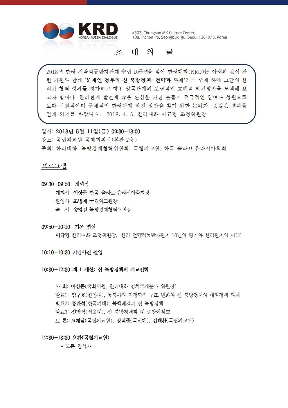 공동학술회의: ‘문재인 정부의 신 북방정책: 전략과 과제’ (5월 11일, 국립외교원)
