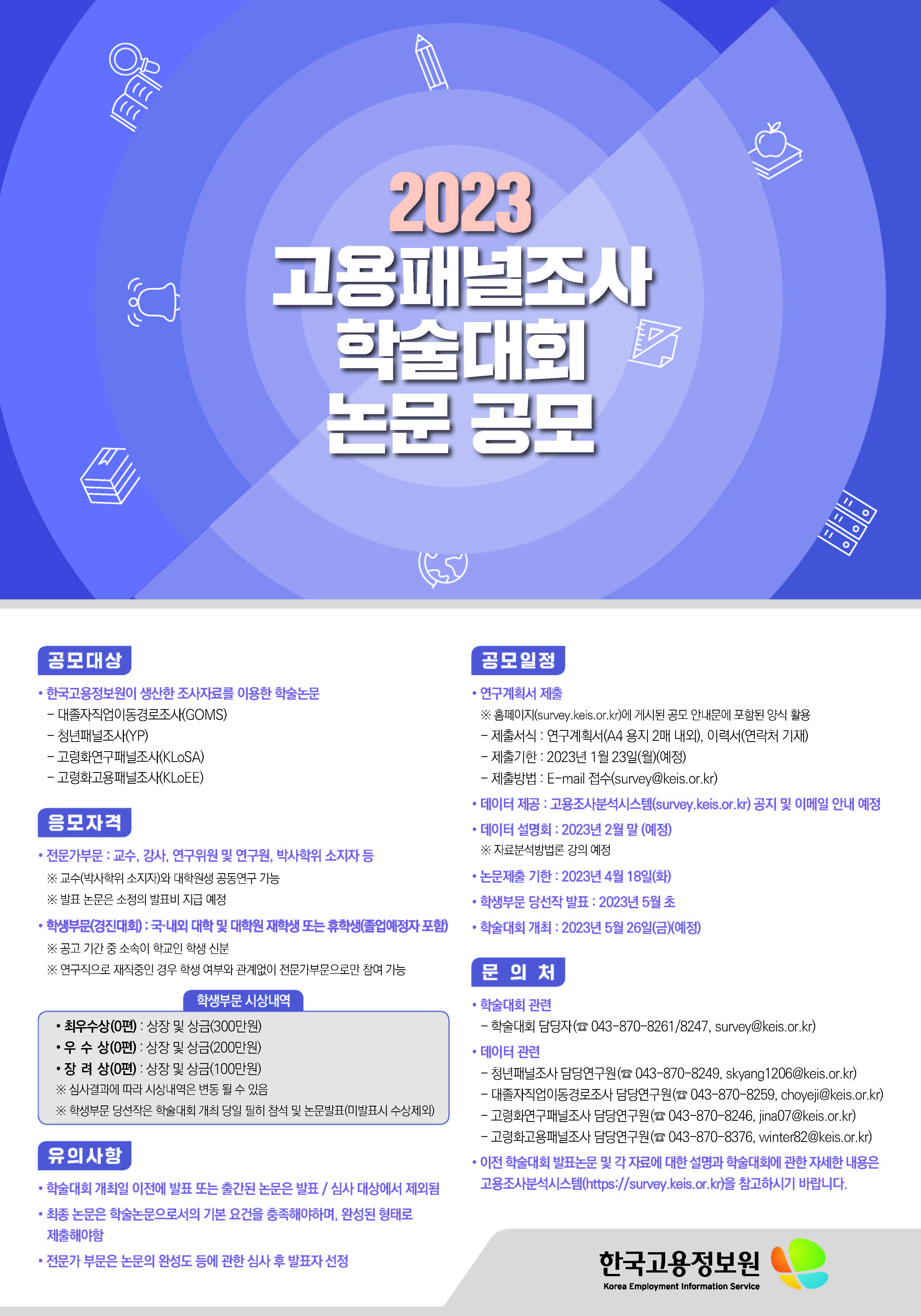 ※ 자세한 사항은 첨부파일 「2023 고용패널조사 학술대회」 논문 공모 안내(연구계획서 포함) 및  「2023 고용패널조사 학술대회」 논문 공모 안내 포스터를