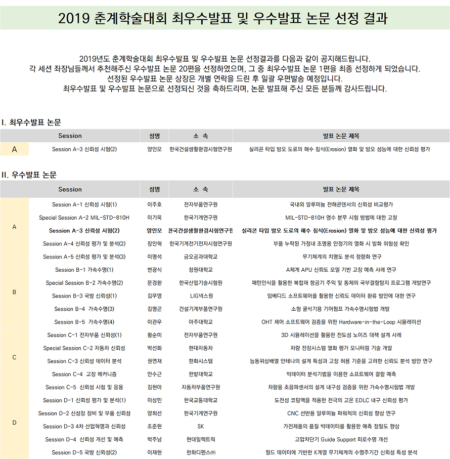 2019년 춘계학술대회 최우수발표 및 우수발표 논문 선정 결과