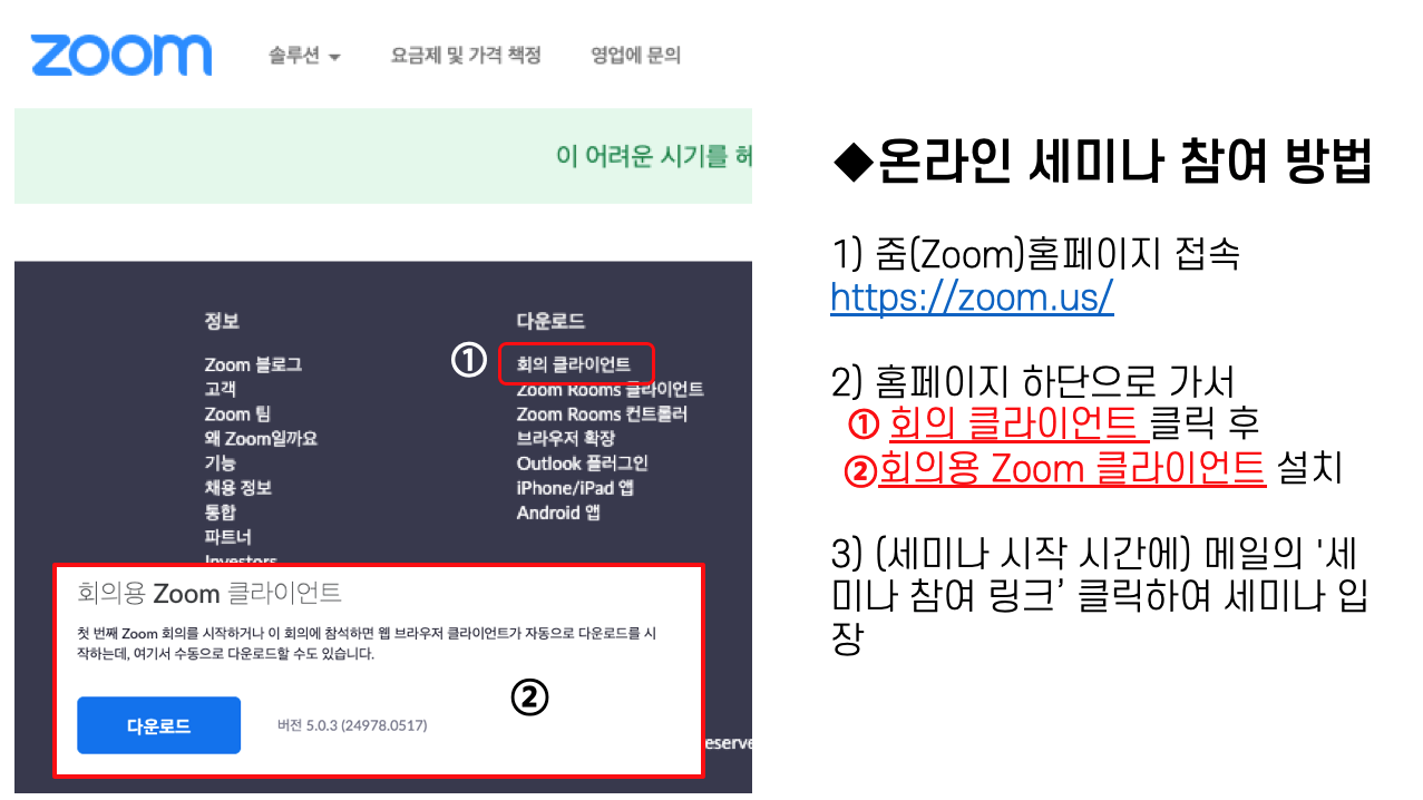 2) 컴퓨터의 경우 줌 프로그램(휴대전화의 경우 줌 어플)을 설치 후 아래의 세미나 참여 링크를 클