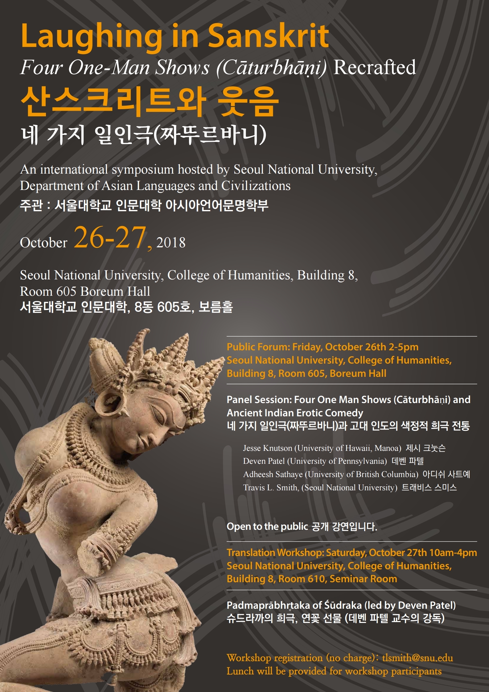 Laughing in Sanskrit: Four One-Man Shows (C?turbh??i) Recrafted , an international symposium hosted by the Department of Asian Languages and Civilizations, Seoul National University, will take place on October 26-27, 2018