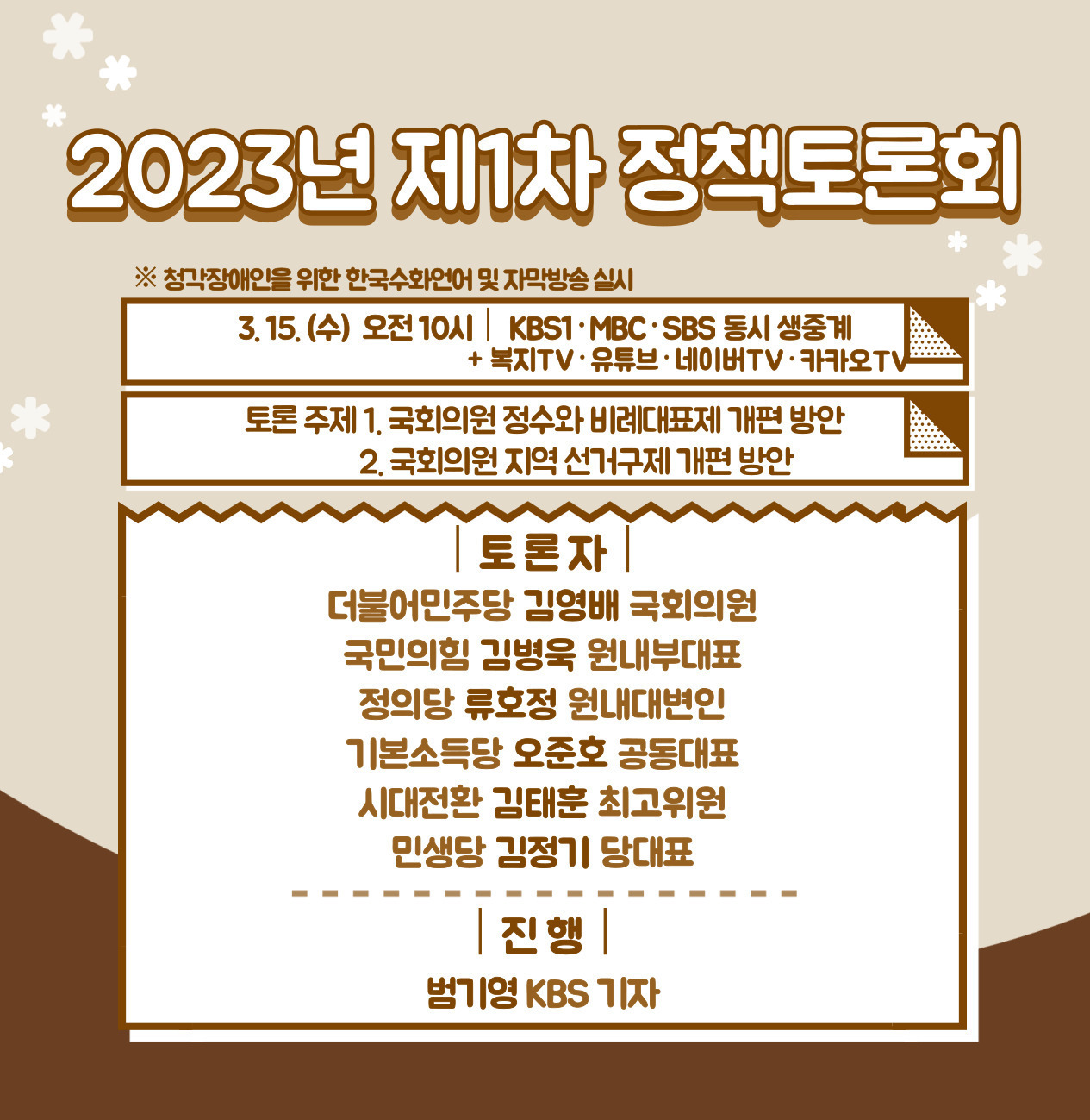 2023년 제1차 정책토론회는 오는 3월 15일(수) 오전 10시~12시까지 120분 동안 KBS1과 MBC, SBS 등의 채널을 통해 전국에 생중계됩니다. 6개 정당이 한자리에 모여 ‘국회의원 정수와 비례대표제 개편 방안’과 ‘국회의원 지역 선거구제 개편 방안’ 주제로 토론을 벌일 예정이오니, 관심 있는 분들의 많은 시청 부탁드립니다.