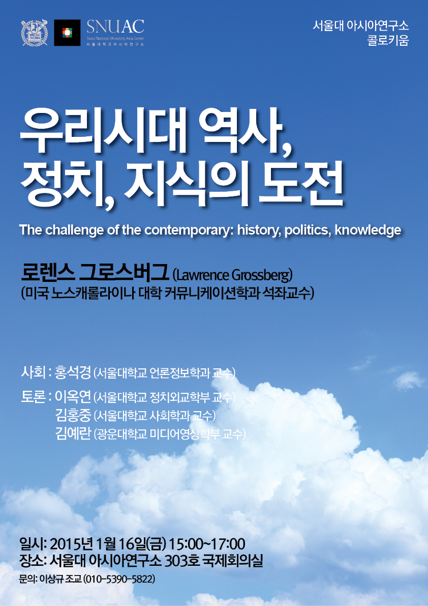 - 이번 강연의 화두는 오늘날 미국사회의 지식인의 역할이다. 현대 사회에서 일련의 정치적 갈등, 제도적 압력, 이론적 교착상태 등의 복합적 결과로 지식의 지위가 낮아지고 있는 상황에 대해 진단하며, 현재 맥락의 복잡성을 파악할 수 있는 또 다른 지적 실천의 가능성을 모색한다. 우리시대가 당면한 현실 맥락을 다음과 같이 상호모순적인 여러 상황의 복합적 효과로 분석한다. (1) 현재와 미래에 대해 수동적이고 냉소적인 사람들, (2) “시장근본주의(market fundamentalism)”라고도 할 수 있는 현상유지에 만족하는 사람들, (3) 과거 어느 때보다도 정치적 실천(political activism)과 투쟁의 감각(a sense of struggle)은 강하지만, (4) 그 실천들이 효과적인 사회운동으로 구축되기에는 놀랄 만큼 무기력한 상황. 그로스버그 교수는 이 교착된 상황을 문화의 문제로 이해하는데, 특히 일종의 “감정의 구조”로서의 문화, 정동(affect)의 문제를 제기한다. 정동의 문제가 어떻게 일상생활과 사회제도적 역사 간의 관계를 결정짓는 의미와 문제제기의 지형도와 연결되어 있는지를 다룰 것이다.