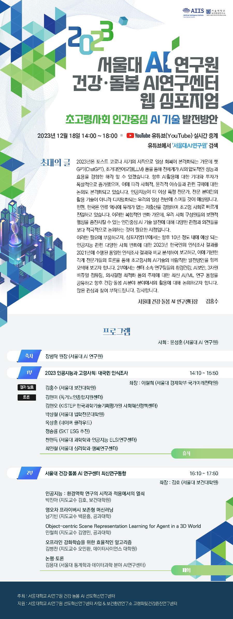 서울대학교 AI연구원에서 2023 서울대 AI 연구원 건강·돌봄 AI 선도혁신연구센터 웹 심포지엄’을 개최합니다.