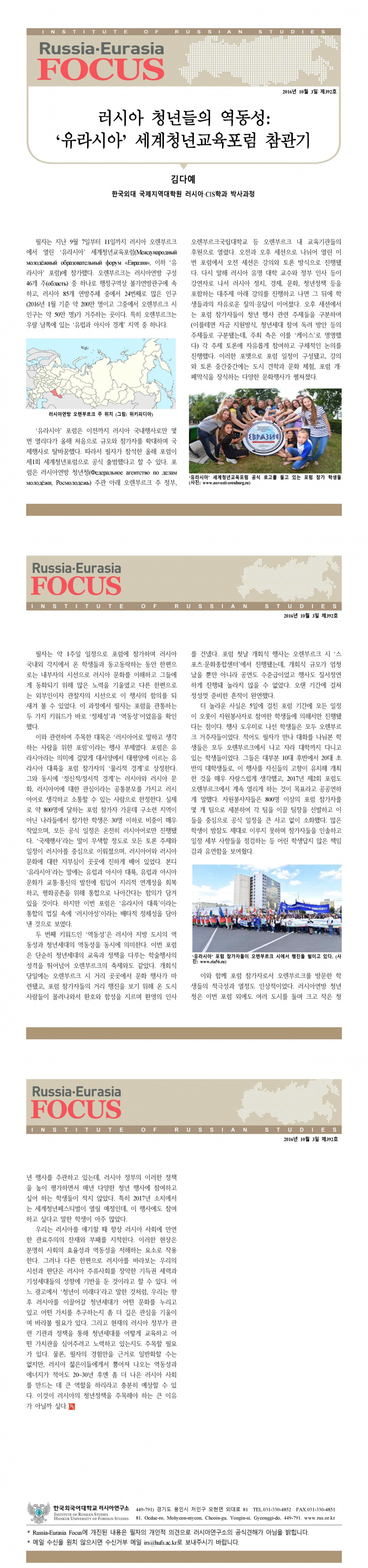 제392호 러시아 청년들의 역동성: ‘유라시아’ 세계청년교육포럼 참관기