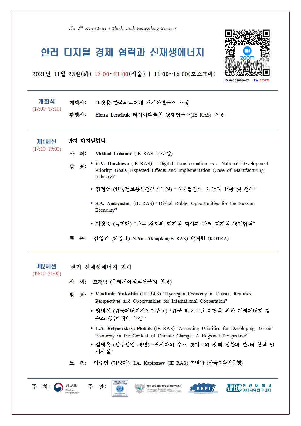 두번째 행사로 러시아 학술원 산하 경제연구소(IE RAS) 공동으로 '한러 디지털 경제 협력과 신재생에너지' 라는 주제로 다음과 같이 세미나를 개최하오니 많은 관심과 참여 부탁드립니다.
