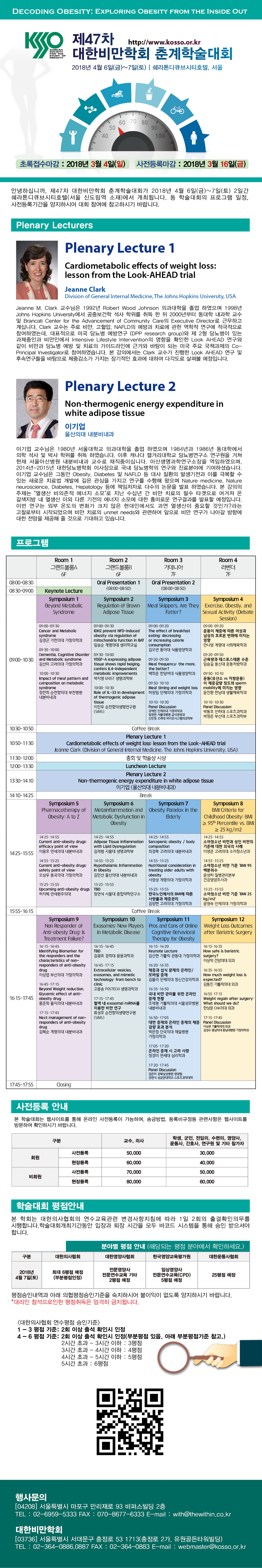 미국 존스홉킨스 대학의 Jeanne Clark 교수님과 울산의대 이기업 교수님을 모시고 2개의 기조 강연을 준비하였습니다. Jeanne Clark 교수님은 체중 감량이 심혈관질환과 대사질환에 미치는 영향에 대해 강의해 주실 예정이고 이기업 교수님은 갈색 지방 조직에 대한 강의를 해주실 예정입니다그 외에도 식사 요법에 있어서 논란이 되는 여러가지 문제들행동치료에 있어서의 온라인 중재에 대한 논란들, 소아청소년 비만 진단 기준에 대한 이슈운동과 성적 활동성에 대한 논란비만대사 수술에 대한 논란대사증후군의 새로운 면모들에 대한 논란비만약물에 반응하지 않는 환자에 대한 방침, 대사 질환에 있어서 exosome의 역할갈색 지방 조직의 조절대사과 관련된 염증 반응의 문제현재 사용되고 있는 혹은 향후 개발될 비만 약물들의 논란그리고 노인에서의 벌어지는 비만의 역설 등 실로 다양한 영역의 12가지 세션을 구성하여 비만에 대한 많은 문제들을 다루어 보고자 합니다.