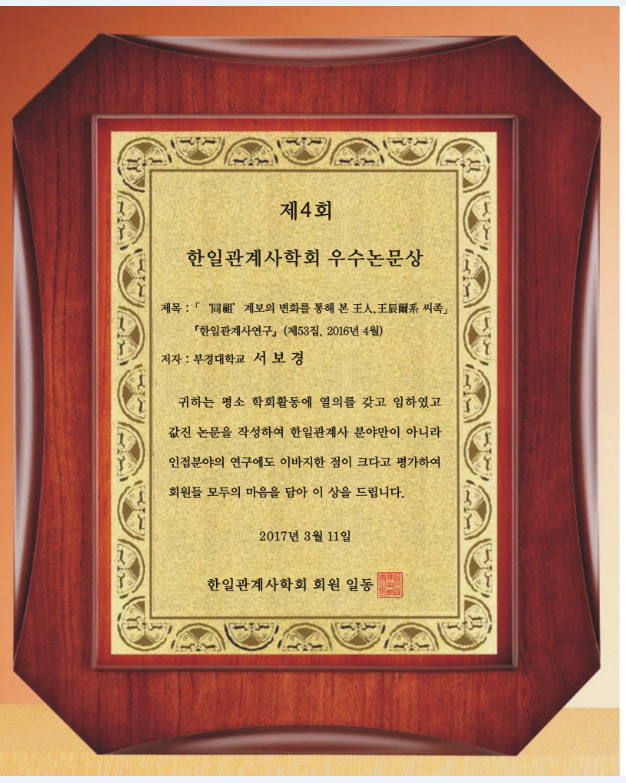 시상 논문은 「‘同祖’ 계보의 변화를 통해 본 王人,王辰爾系 씨족」(『한일관계사연구』(제53집, 2016년 4월)였습니다.