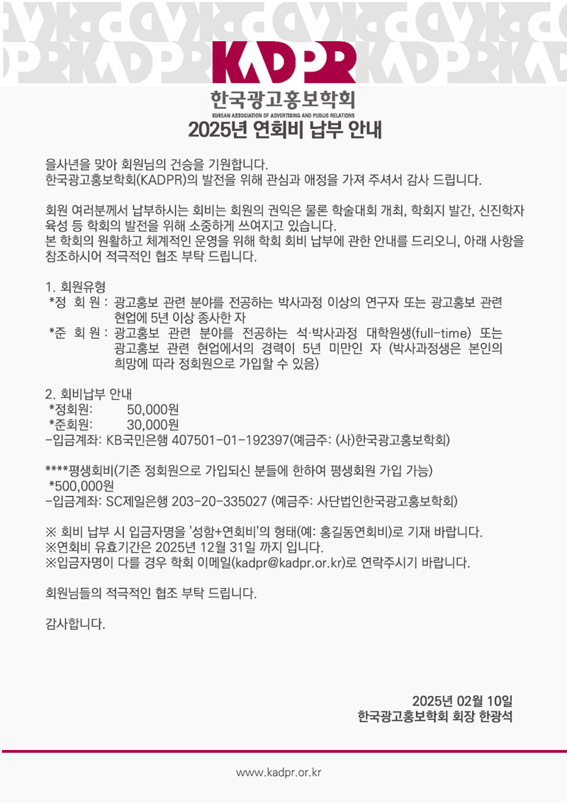 [KADPR]한국광고홍보학회 2025년 연회비 납부 안내