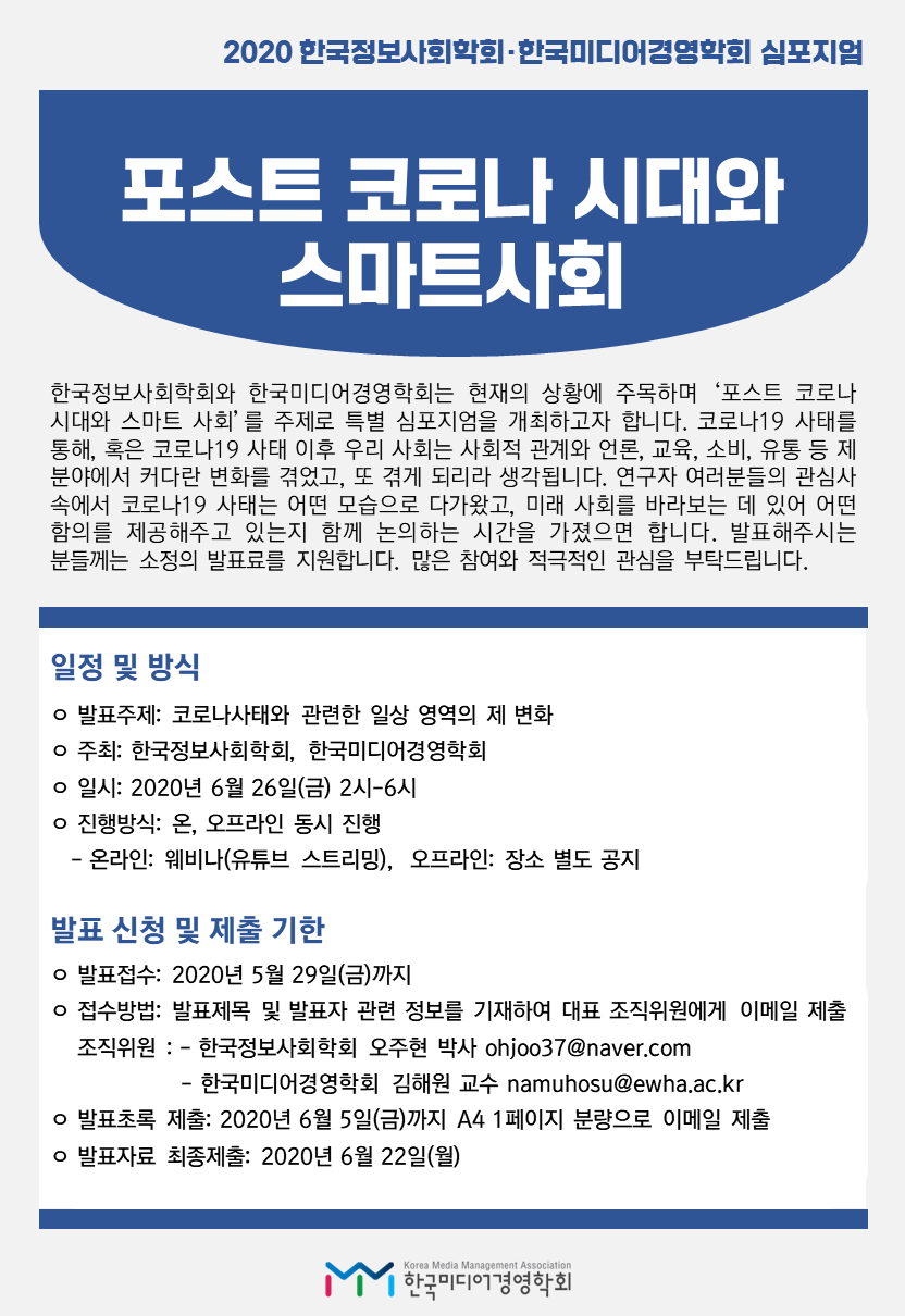 [안내] 2020 한국정보사회학회-한국미디어경영학회 심포지엄 <포스트 코로나 시대와 스마트사회>