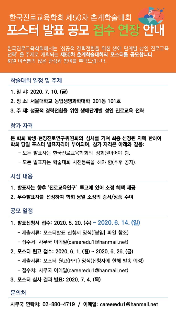 저희 학회에서는 오는 7월 10일에 개최되는 제50차 춘계학술대회의 포스터 발표 공모를 진행하고 있으며, 신청서 접수 기간을 6월 14일(일)까지 연장함을 안내드립니다.