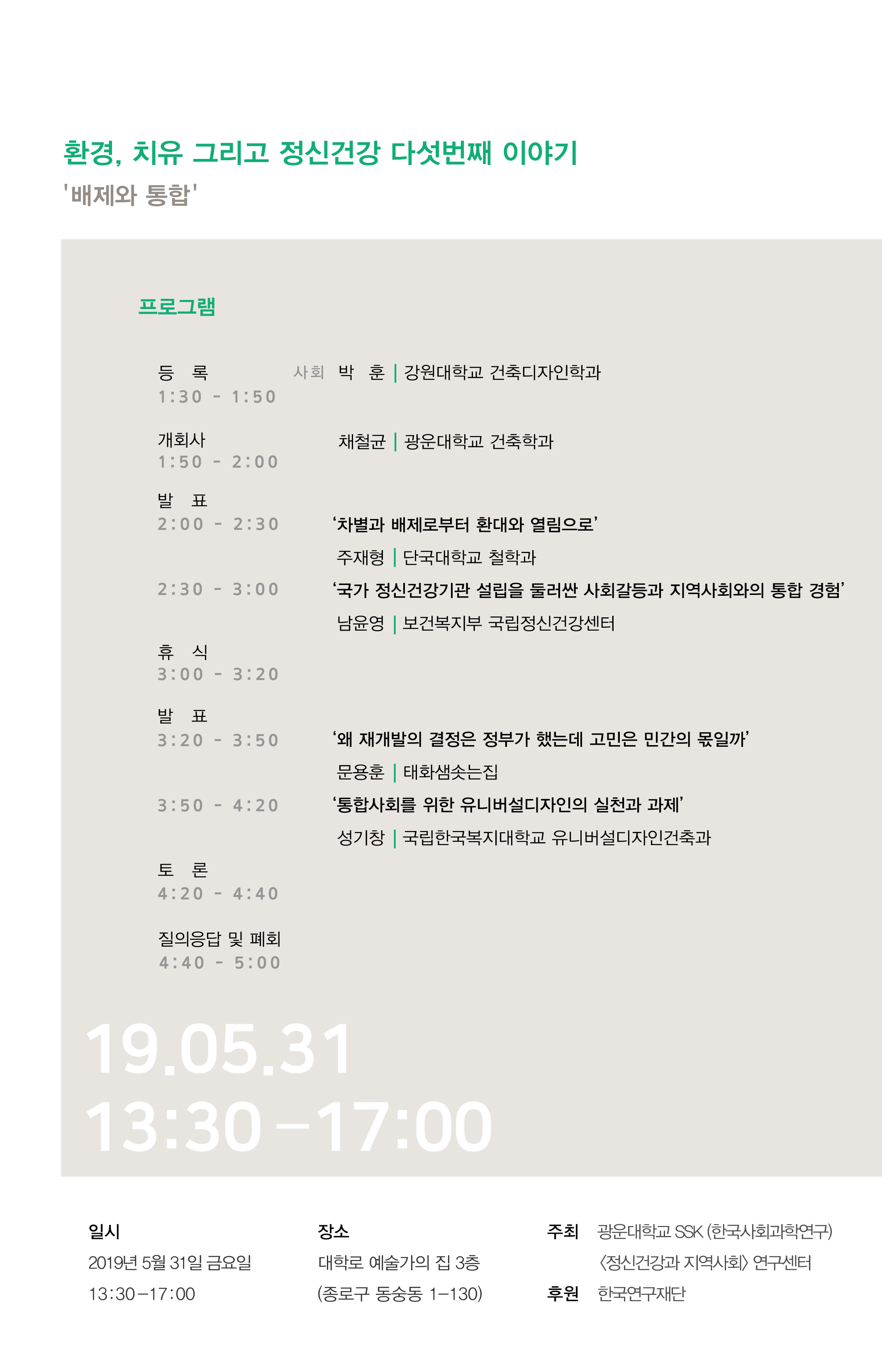 한국사회과학연구지원(SSK)사업의 일환으로 연구를 진행중인 '정신건강과 지역사회' 연구센터입니다. '환경, 치유 그리고 정신건강' 이라는 주제로 진행되는 심포지엄에 여러분들을 초대하고자 합니다. 이번 심포지엄은 벌써 다섯 번째를 맞이하고 있으며 <배제와 통합>이라는 주제로 이야기를 풀어나가고자 합니다.