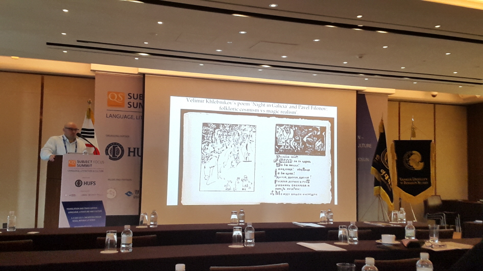 러시아연구소는  2017 년  7 월  7 일 서울캠퍼스 국제관  104 호에서 해외학자초청 강연의 일환으로 데니스 요페 (Dennis Ioffe)  네덜란드 암스테르담 대학교 (University of Amsterdam)  교수를 초청하여 본인의 연구 관심사인 러시아 문학 모던이즘과 아방가르드 러시아 언어 철학은 물론 최근 유럽의 러시아 · 슬라브학 연구 경향에 대한 강연을 가졌다 세계적 지명도를 지닌  Russian Literature (Elsevier 출판사 간행 ) 저널의 공동 편집장이기도 한 요페 교수는  7 월  5~7 일 동안 세계적 대학평가 기관인  QS (Quacquarelli Symonds) 와 한국외국어대학교가 공동으로 개최한  “QS Subject Focus Summit  –  Language, Literature, and Culture” 에 한국외대 러시아연구소 초청 연사로 참석하여  “Vladimir Khlebnikov’s Poem ‘Night in Galicia’ and Pavel Filonov: Folklorik Cosmism vs. Magic Realism” 라는 제목의 논문도 발표함으로써 국내 슬라브 문학 · 문화 · 민속학 연구자들과 폭넓은 논의의 시간을 가졌다 .