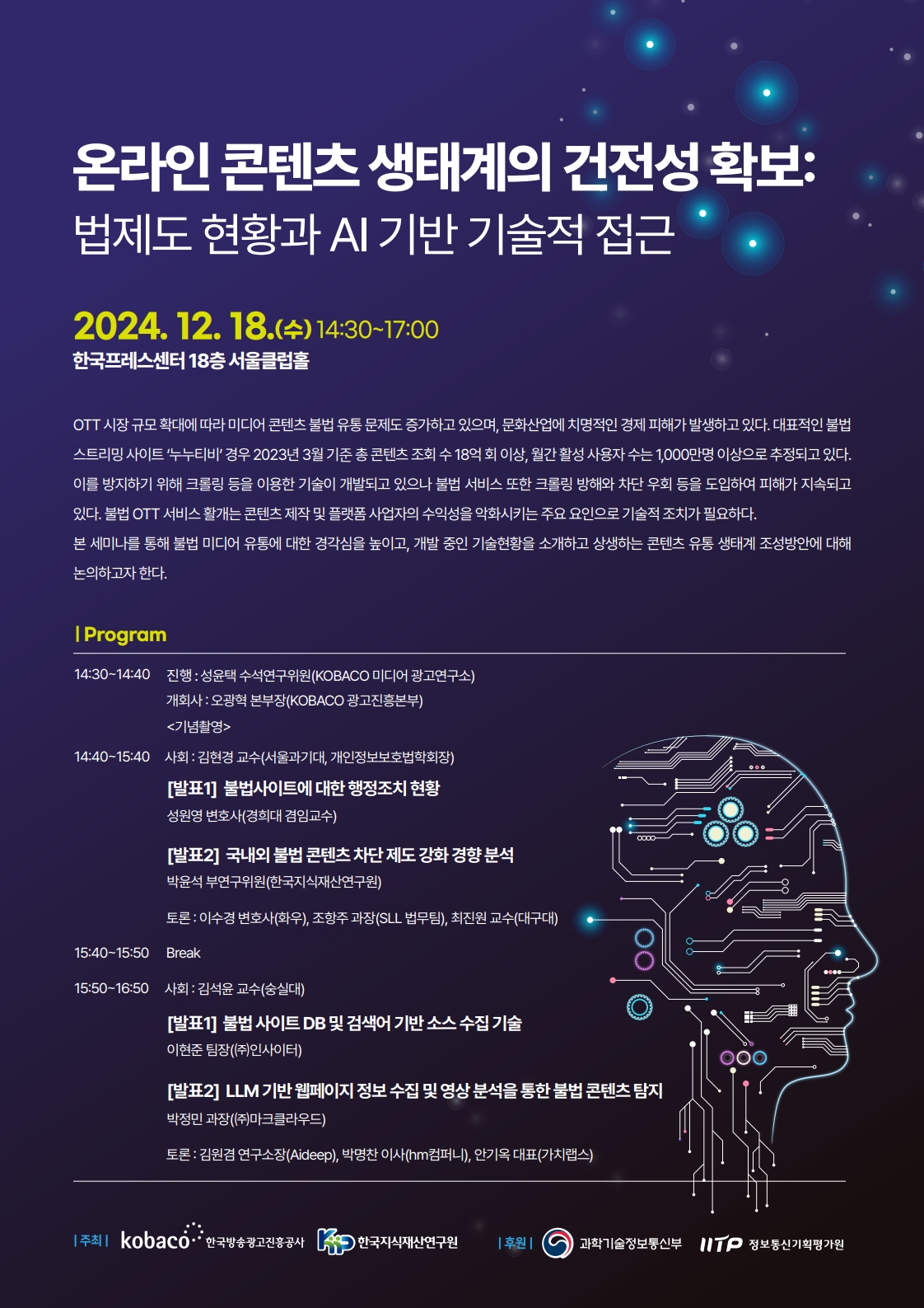 본 세미나를 통해 불법 미디어 유통에 대한 경각심을 높이고, 개발 중인 기술현황을 소개하고 상생하는 콘텐츠 유통 생태계 조성방안에 대해 논의하고자 한다.