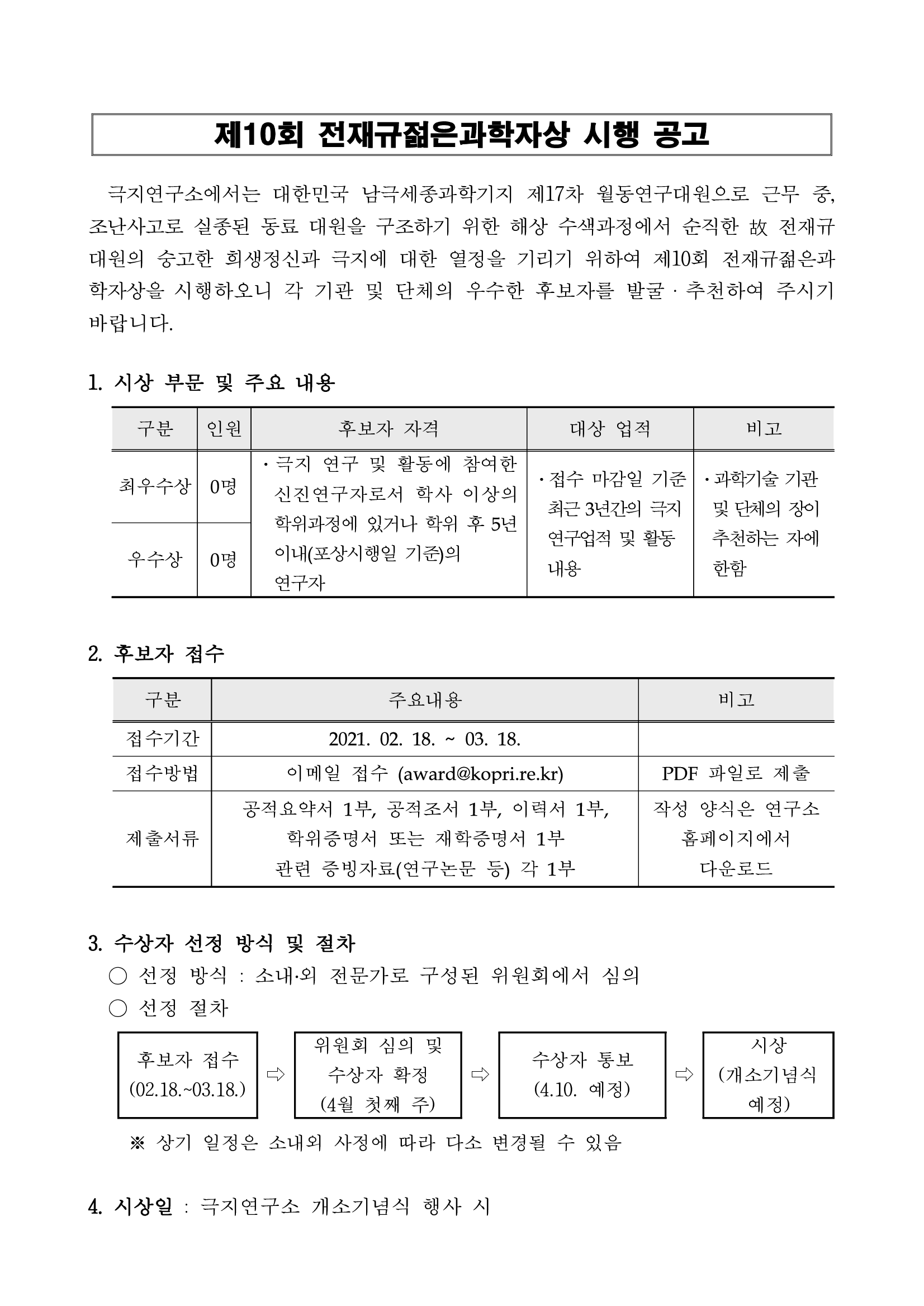 제10회 전재규젊은과학자상 시행 공고문