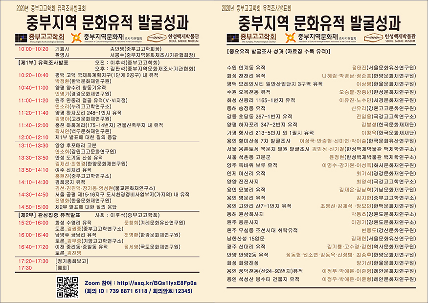2020년 중부지역의 중요유적 발굴성과에 대한 여러 기관의 발표가 준비되어 있으니 회원 여러분의 많은 관심과 참여 부탁드립니다.
